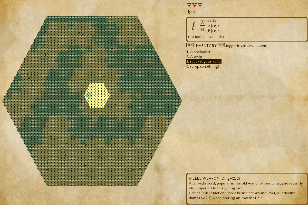 As I stated, I want the map to be randomly generated, but I'm not aiming for a huge world. My current testing version generates a landscape encircling a diameter of about 400 hexes, surrounded by endless desert. Rather than each playthrough taking place on an entirely different planet, I'm envisioning different regions in one and the same world. For one thing, it'll make a lot more sense if later I implement ghosts, or even the option for retired characters to show up as NPCs in later games. It also means I can write quite specific lore to reflect a single world/culture, and possibly conceive of one or more overarching plots, possibly even win conditions. (And yet, why bother with win conditions; doesn't an unwinnable game world highlight the very strengths of the RL genre?)